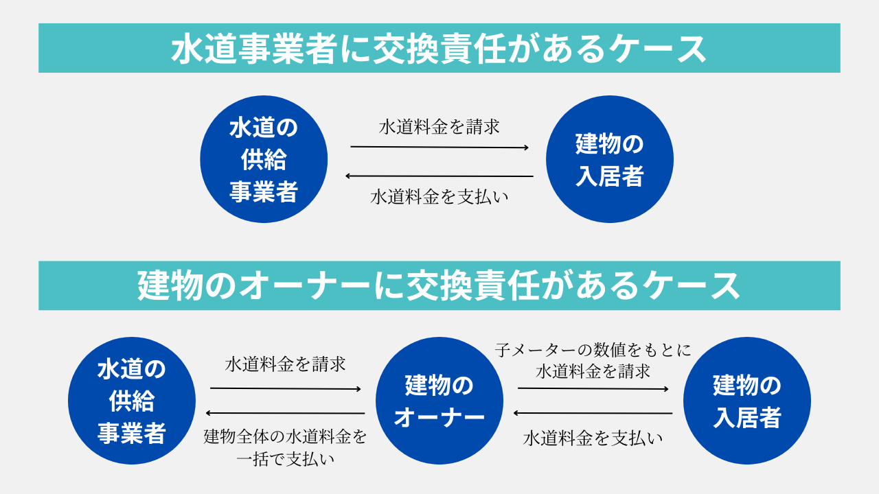 一方、マンション、アパート、寮などの集合住宅の場合、オーナーが建物全体の水道料金を一括して払い、入居者に使用量に応じて個別に請求するという形をとっている場合は水道メーターの交換責任はオーナーにあります。