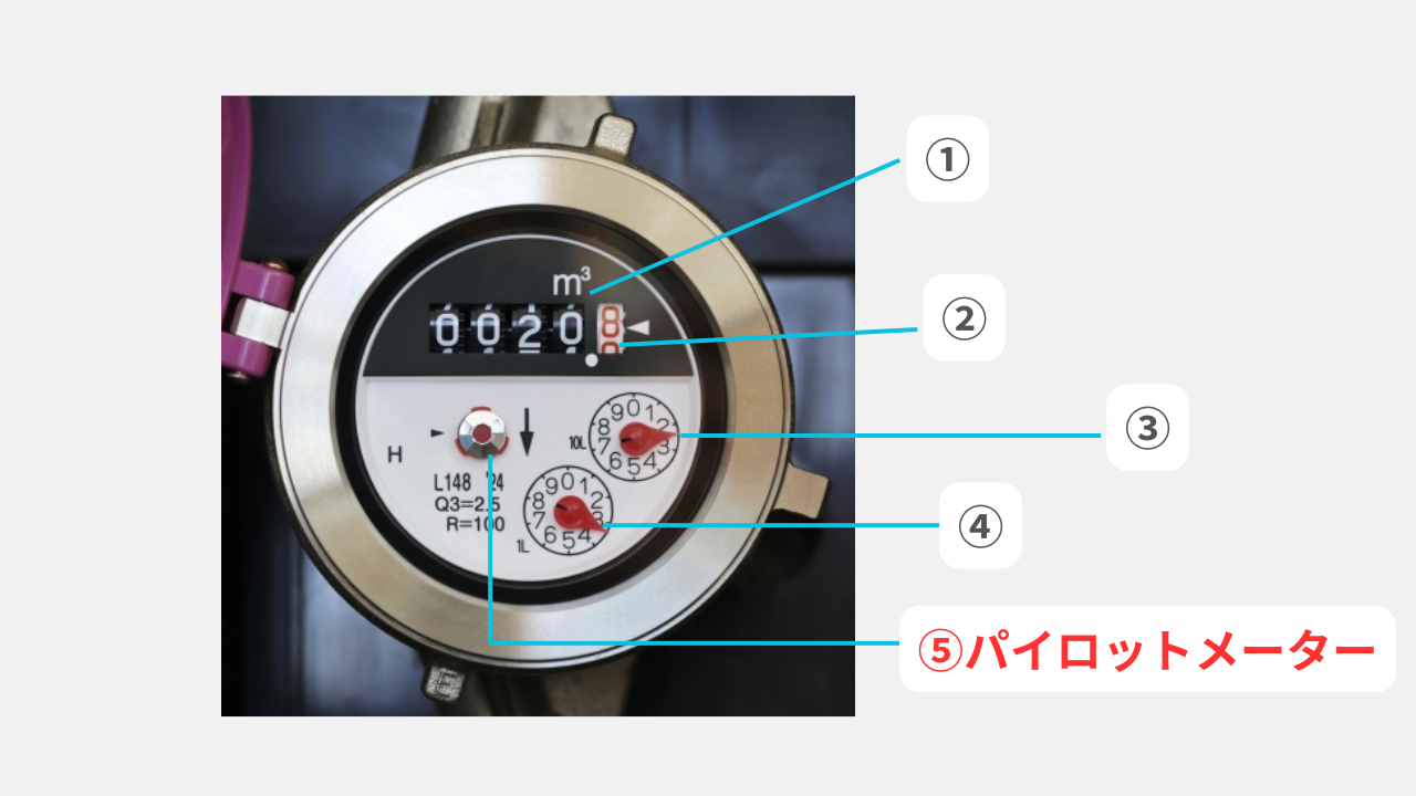 つまり、厳密にはこの写真の水道メーターの指示数は「20立方メートル+823リットル」ですが、水道料金は立方メートル単位で計算されるため、②、③、④で示される数値は切り捨てとなります。